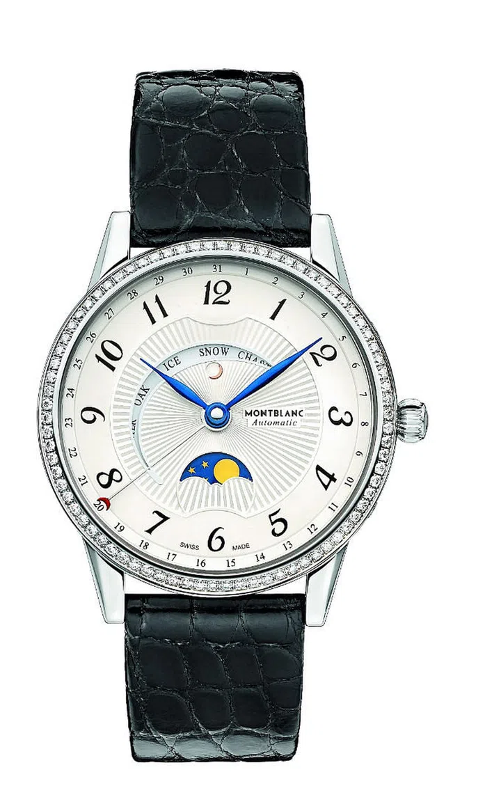 The German brand’s Boheme Moongarden displays names for each month’s full moon instead of the traditional names of the months. Ice is January, Snow is February, Chaste is March, Seed is April, Bright is May, Dyan is June, Rose is July, Red is August, Fruit is September, Harvest is October, Hunter is November, and Oak is December. There’s also a day/night indicator in the form of a moon-phase disc at 6 o’clock.