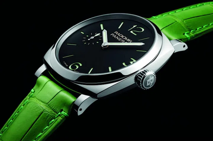 It’s almost impossible to miss the Radiomir 1940 3 Days Acciaio 42mm PAM00574 ($10,900) when it comes with a lime-green strap. Panerai has also switched the Super-Luminova (a glow-in-the-dark pigment) hour markers and hands from vintage beige to green. The timepiece is equipped with a new entry-level in-house P.1000 movement, and a three-day power reserve.