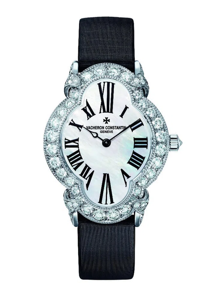 The curved case of the Heure Romantique (price unavailable) is adorned with 104 round-cut diamonds. The watch also has a mother-of-pearl dial.