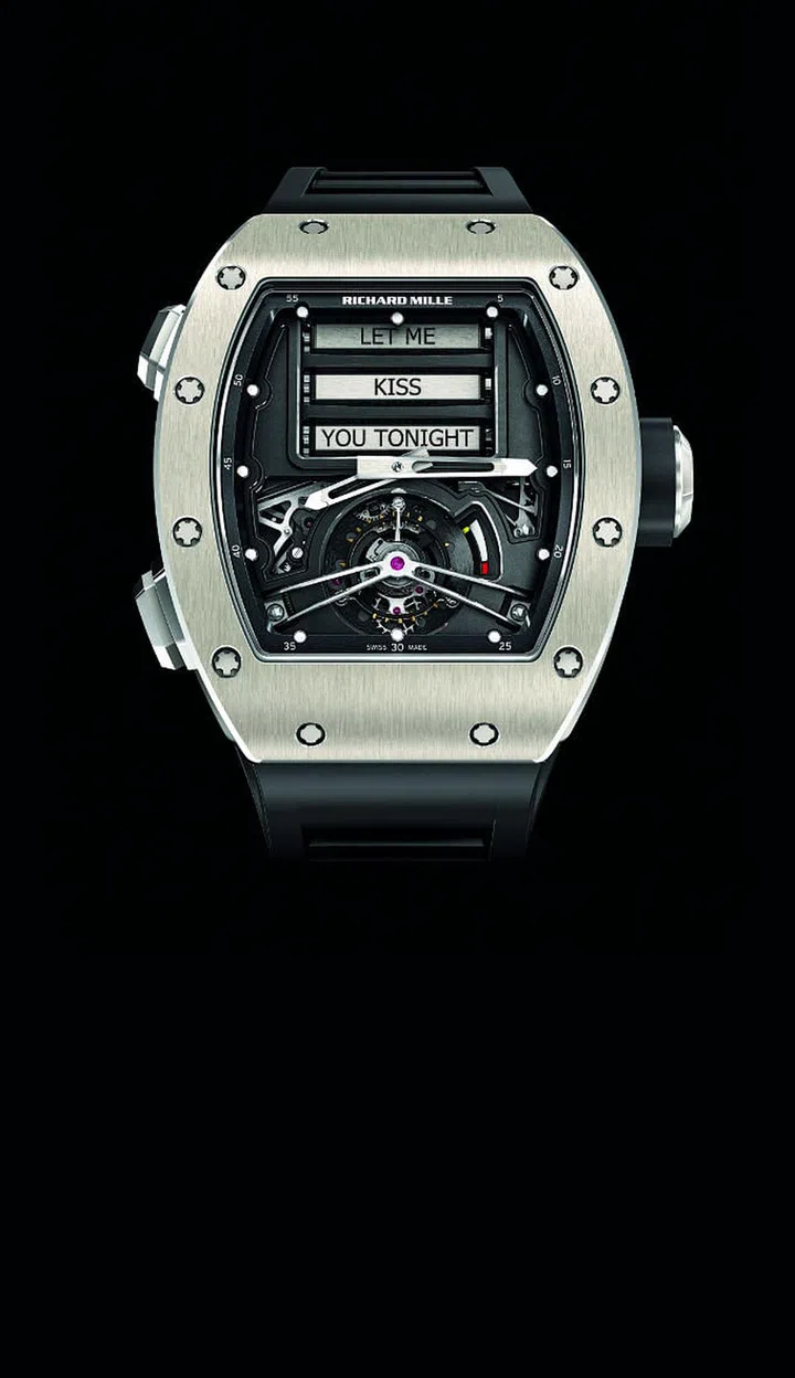 What you see above is one of the tamest messages the RM69 Erotic Tourbillon (price unavailable) will display when you press the 10 o’clock pusher. Each facet on the dial holds a phrase or word like “I long to”, “let me”, “I need to”, “explore”, “your lips”. The watch has 216 message permutations, and for a better view of the lines, the push piece at the case’s 8 o’clock position will temporarily rotate the hour and minute hands out of the way. Only 30 pieces are available in the world.