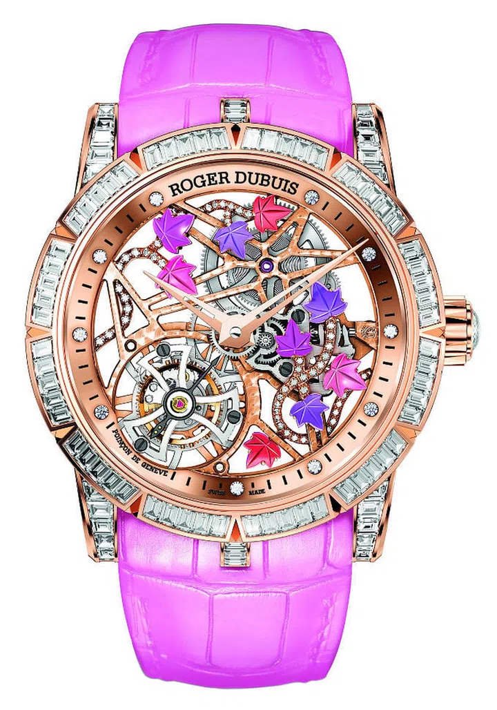 It’s hard to think of a more masculine brand than Roger Dubuis, with its large timepieces distinguished by bold skeleton details. The 42mm Creative Skeleton Excalibur Broceliande fits the brand’s DNA, but this model is also super-feminine, with diamonds and a pink croco strap. The skeleton bridges are entwined with diamond-set vines, and handpainted pink and purple leaf details. Only 28 are available worldwide.