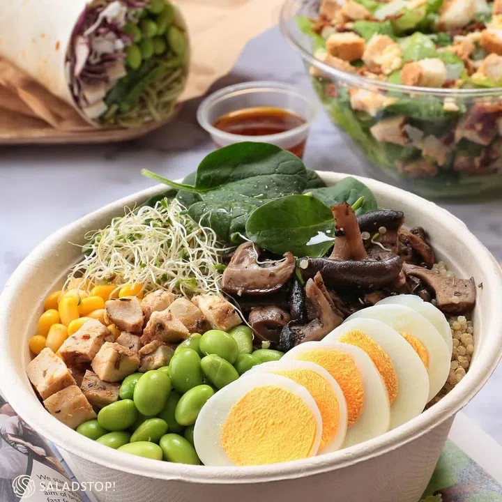 Great salads on a budget! A basic salad with five toppings and one dressing starts at S$4.90. You can swap your lettuce base for a baby spinach base for a dollar and add more premium toppings too.