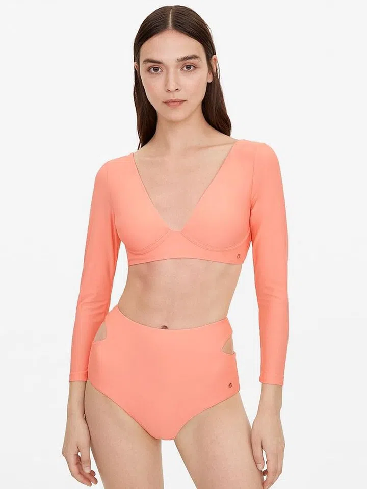 Open Back Long Sleeve Swim Top And Side Cut Out Bikini Bottom in Coral Water, $29 and $24 respectively from Pomelo