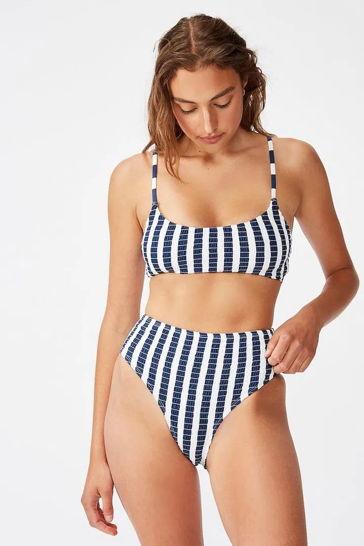 Want to cheat a longer, leaner body by the pool? Go with vertical stripes as it tricks the eye. We recommend playing up the nautical vibes of the blue and white colourway by donning this to a yacht party. Throw on a white shirt when you want to cover up.