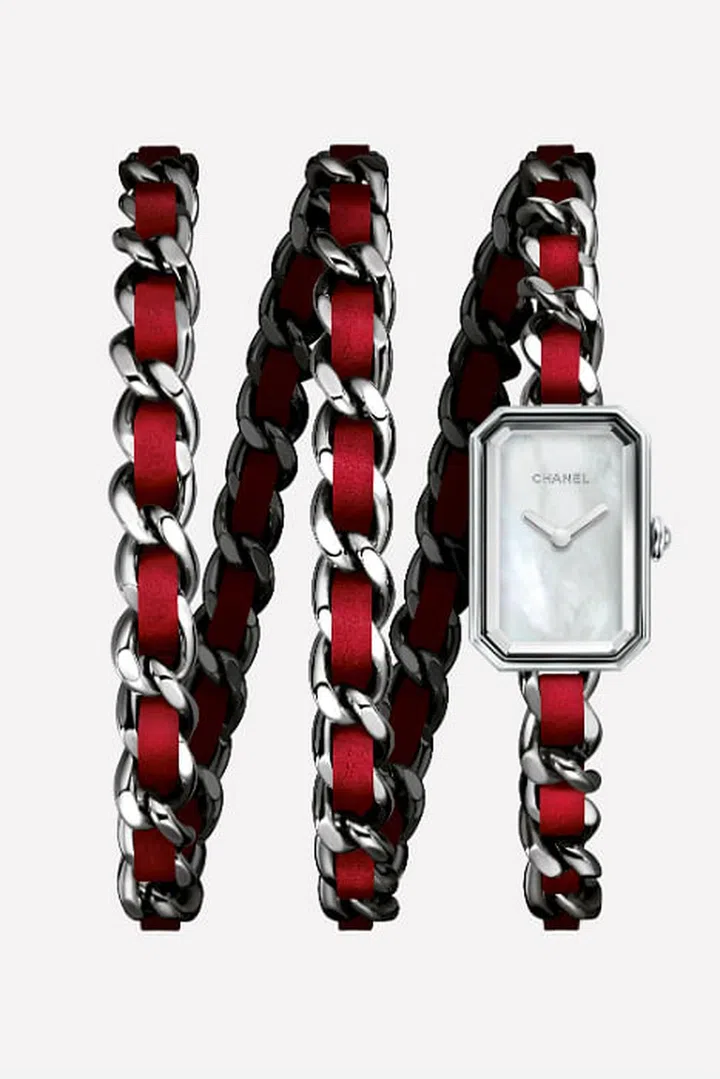 Boasting of red lustrous ribbon woven into a chain bracelet accompanied by a mother of pearl dial (in the shape of the Place Vendome in Paris and the N5 bottle stopper), this timepiece is the most perfect embodiment of the Chanel style.