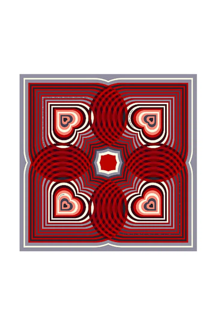 Fashioned from pure silk, this elegant scarf draws on a romantic ideal with linear hearts in alluring shades of red, white, blue and lilac-grey, that intersect continuously.