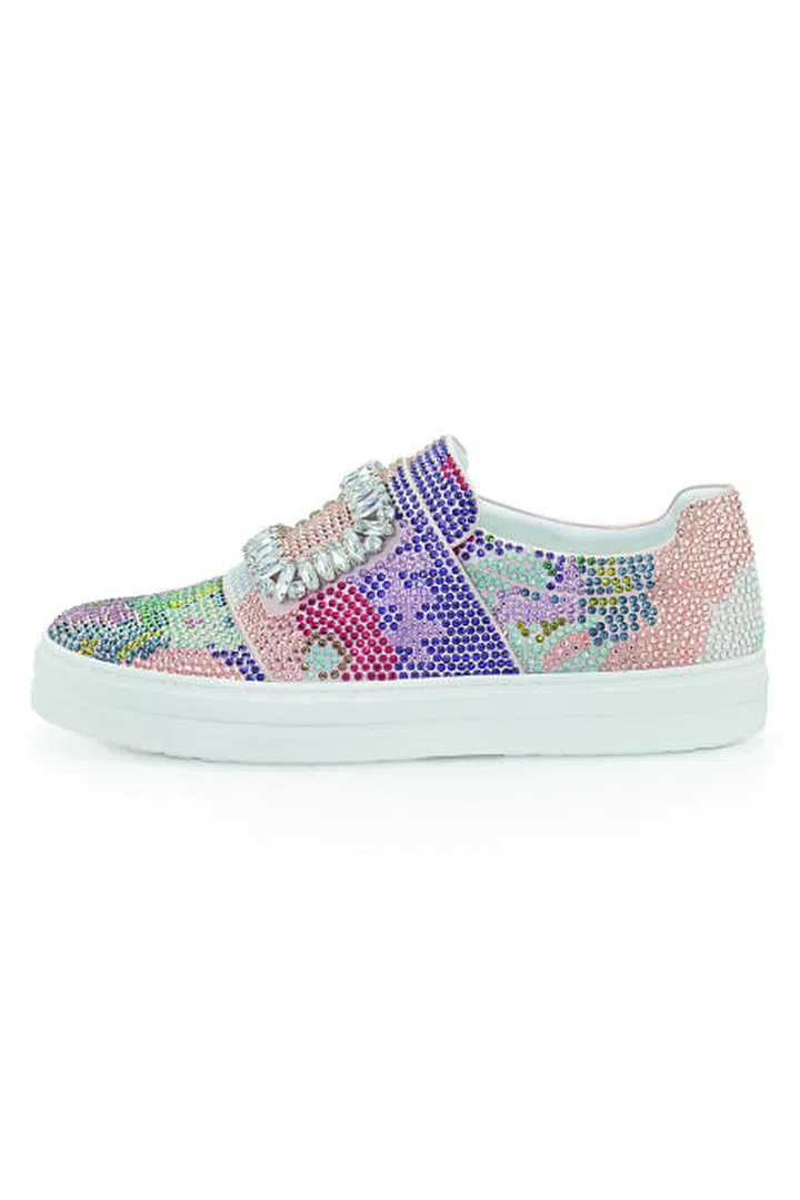 This season, the brand continues to stand out from the crowd with a show-stopping iteration: a pair of soft, shimmering silk sneakers encrusted with dazzling crystals all over on top of the label’s iconic crystal-embellished buckle.