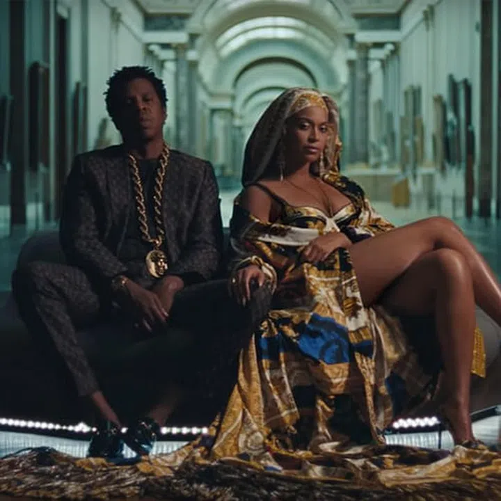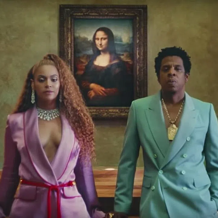 This is Bey and Jay’s narrative and, standing in front of the Mona Lisa, a pale figure in the highly vaunted museum that (like many others) has not placed an emphasis on people of colour, this husband-and-wife powerhouse clad in contrasting tones are suddenly the most interesting things in the room.