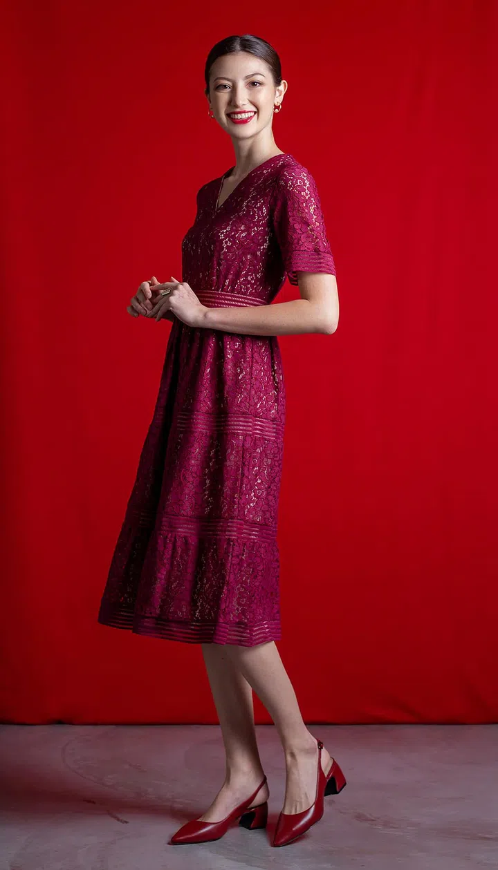When it comes to CNY outfits, red tones are definitely your safest bet. You'll be oozing charm and confidence in this maroon Societe V-neck Fit and Flare Lace Dress, $99.90, that looks both feminine and flirty. Best part: The fitted waist accentuates your figure, while the flare bottom conceals food baby bulges.