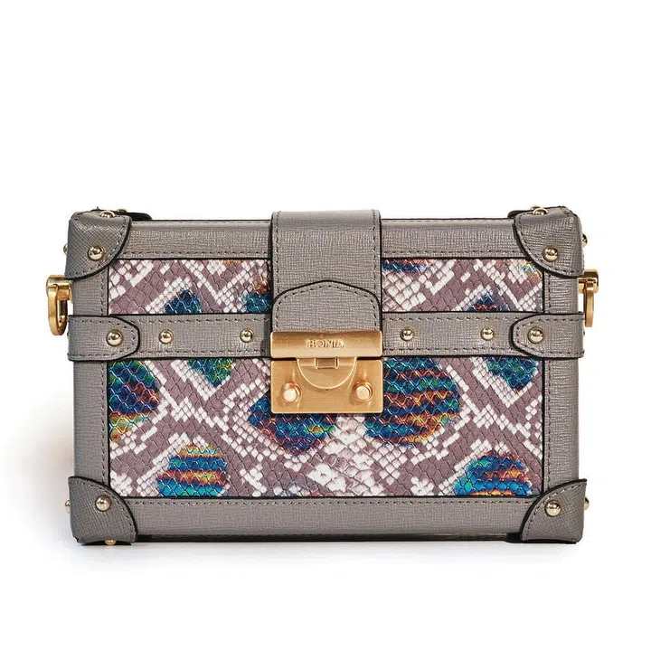 With a vintage silhouette and clasp, the Ethereal Trunk ($395) is a show stopper with its iridescent design. Crafted from leather, the Ethereal Trunk sports a shiny snakeskin inspired embossed leather finish and gold tone hardware.