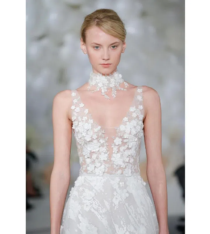 You'll look every part the ethereal bride in this floral-appliqued stunner with an equally charming neck piece.