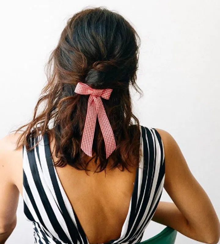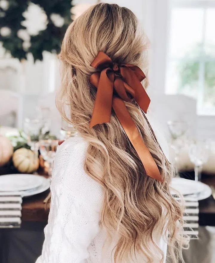 On longer hair, soft waves and a half updo creates a feminine and romantic mood. Go for soft drapey bows with longer ends.