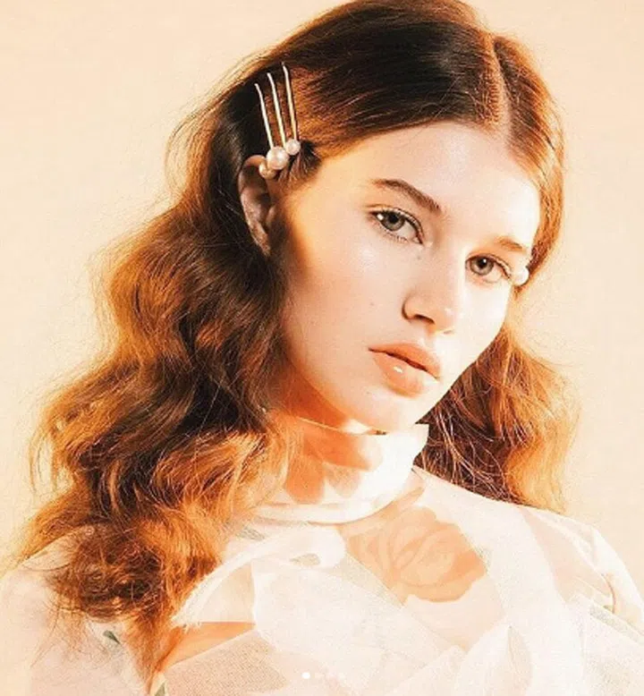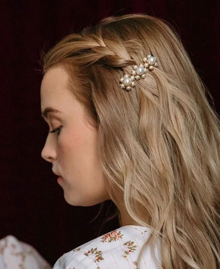 The fashion-forward bridesmaid will love this effortless look - luscious, mussed-up waves with a sleek centre part that pulls focus to the face. Pearl pins pretty up the look and make it extra wedding day-worthy.