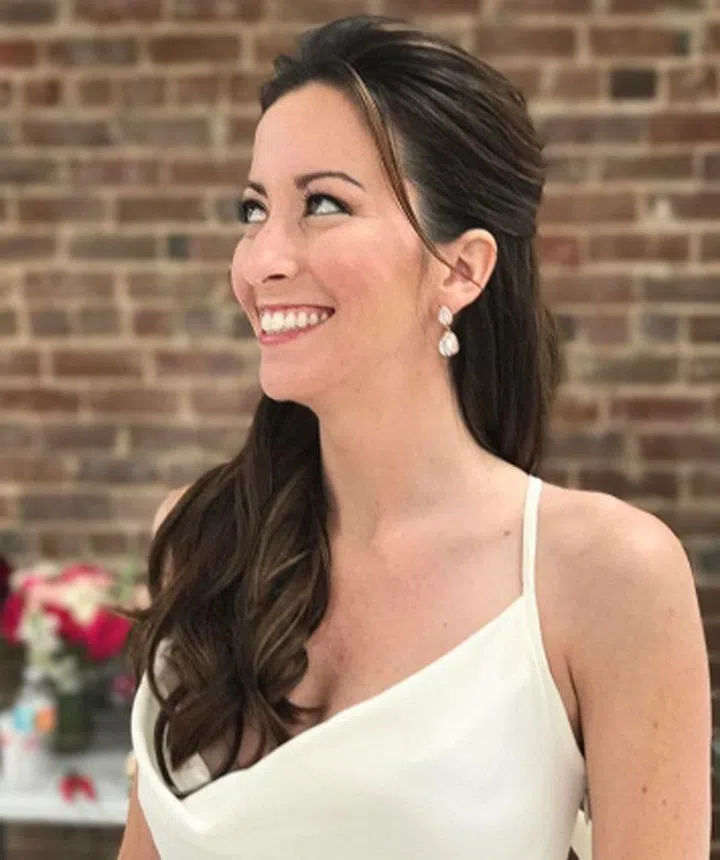 For that sophisticated restaurant celebration or ballroom wedding, this half updo with a loose tendril framing the face for a bit of effortless elegance and just enough volume at the top is perfect.