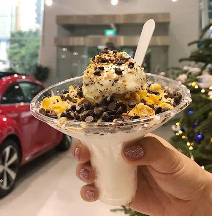 Shaved ice topped with a plethora of toppings like sweetened condensed milk, fruits, Korean rice cake, cereal flakes and ice cream... mmm.
