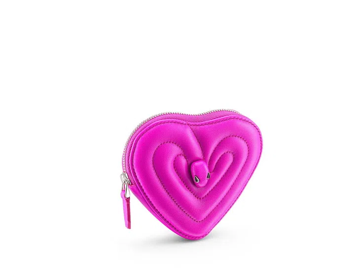 Key pieces include Bvlgari’s iconic Serpenti shoulder bag fashioned with a “smoother” snake clasp, a heart-shaped coin purse, and three-coil Serpenti bracelet – all in several neon shades (blue, purple and green), as well as black.