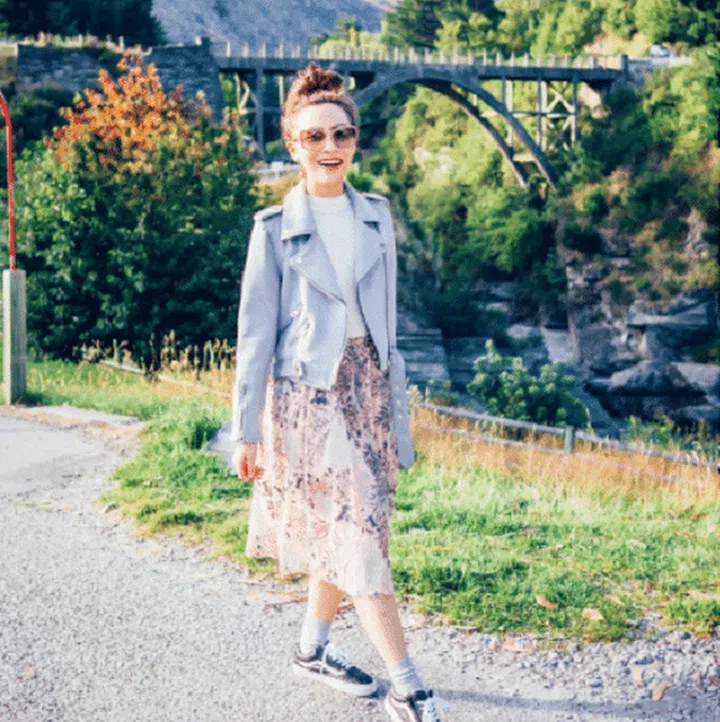 Leather jackets are such a staple when travelling to colder climates. Great for the transitional weather, leather jackets can be layered and can be worn over blouses or sweaters. Instead of opting for the conventional black leather jacket, fashion chameleon Sonia went with a grey leather jacket that complements her pastel hues in her floral midi dress. She topped it all off with some classic Vans that never goes out of style.