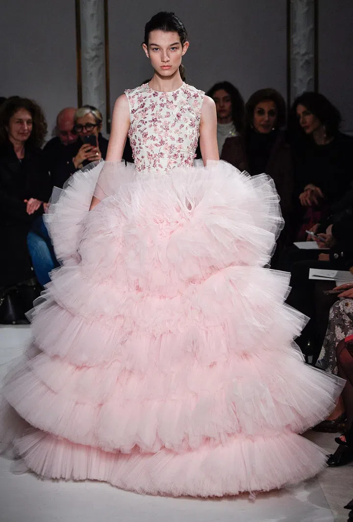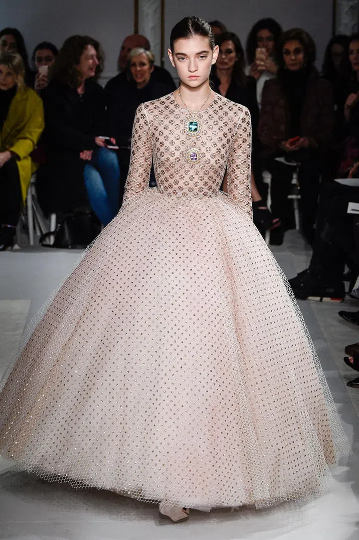Polka dots aren't the first thing to come to mind when it comes to glamorous gowns but trust Giambattista Valli to do just that with this lavish gold and blush number.