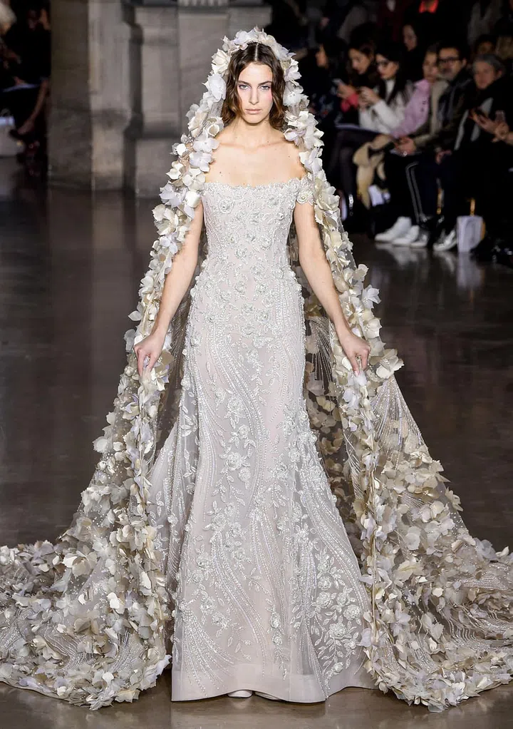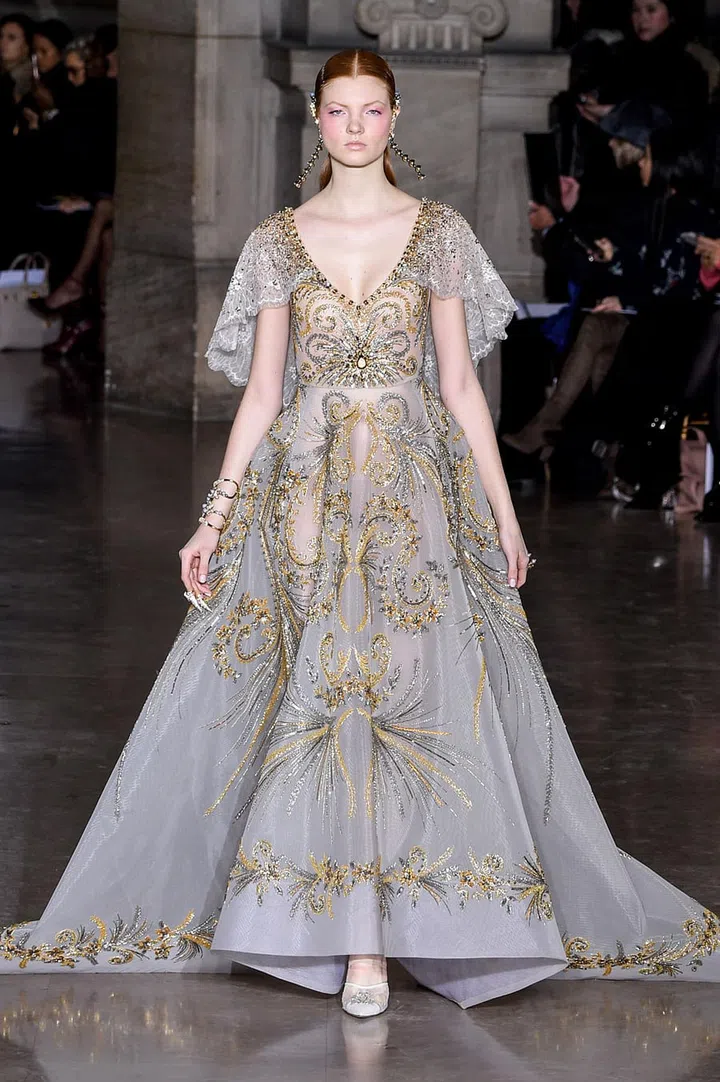 Drift down the aisle looking every part the sparkling bride in this airy Georges Hobeika number with rich, gilded embroidery.