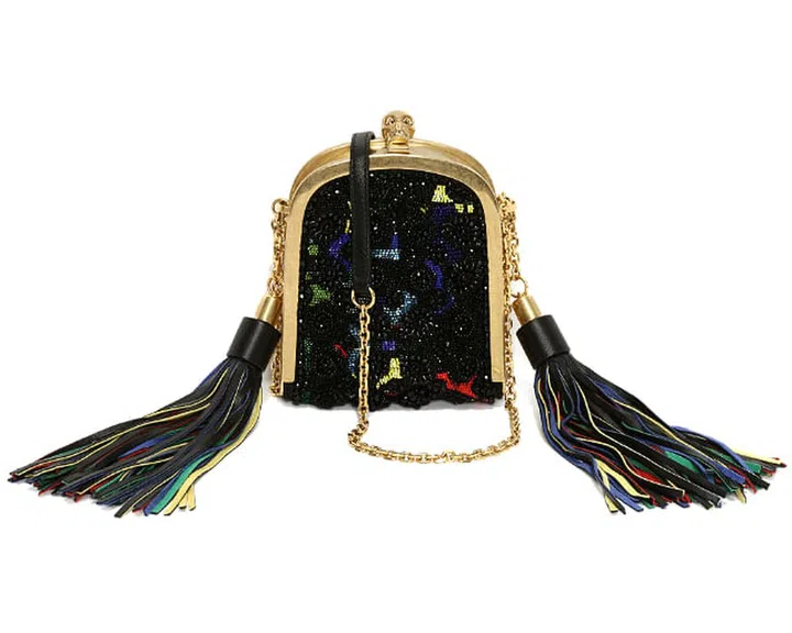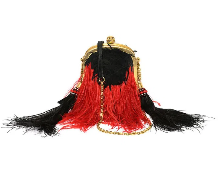 Available with gold studs, black leather tassels, black and red feathers or in three-dimensional multi-coloured bead embroidery with multicoloured leather tassels, the Tassel Skull clutch bag is priced from £1,175 (S$2,473) and available from www.alexandermcqueen.com and selected retail outlets worldwide.