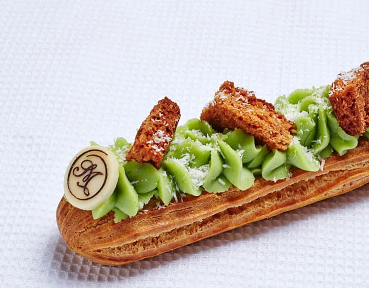 The duo behind Singapore’s most feted eclair boutique has put a local twist to the French classic pastry, perfuming it with an alluring coconut fragrance. Buttery choux is capped with silky house-made kaya pandan cream (we’d prefer it a little lighter though), melt-in-the mouth morsels of kueh bangkit-like coconut cookies and a flourish of desiccated coconut.