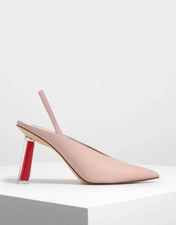 Lend edgy elegance to your work outfit with this pair of nude sculptural slingbacks. Its acrylic statement heel will be a sure conversation starter. Feeling bold? Take it all the way with an electrifying red dress that complements the novel heel.