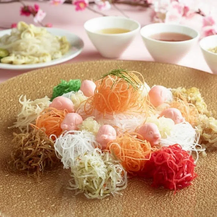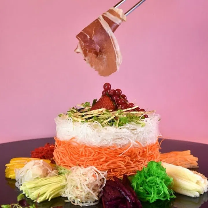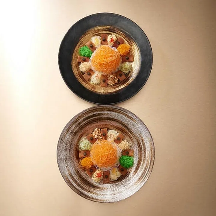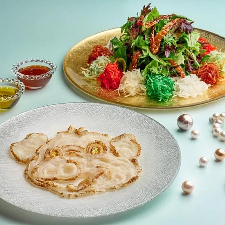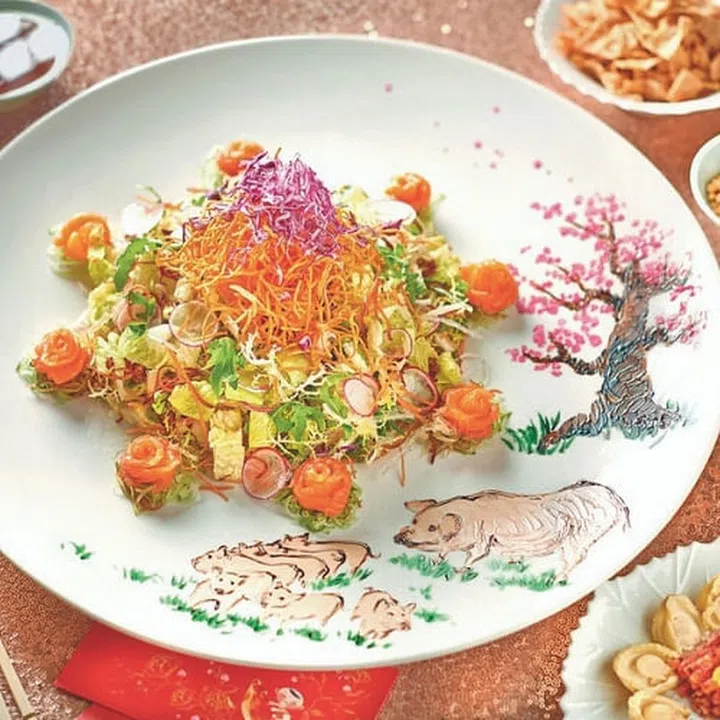Yu Sheng-wise, diners can expect raw salmon slices, abalone and the hotel’s homemade bak kwa topped with yellow pickled radish, accompanied by a medley of crisp vegetables such as wild arugulas, yellow frisee, and red sorrels, as well as sesame seeds and crispy strips of fried sweet potatoes.
