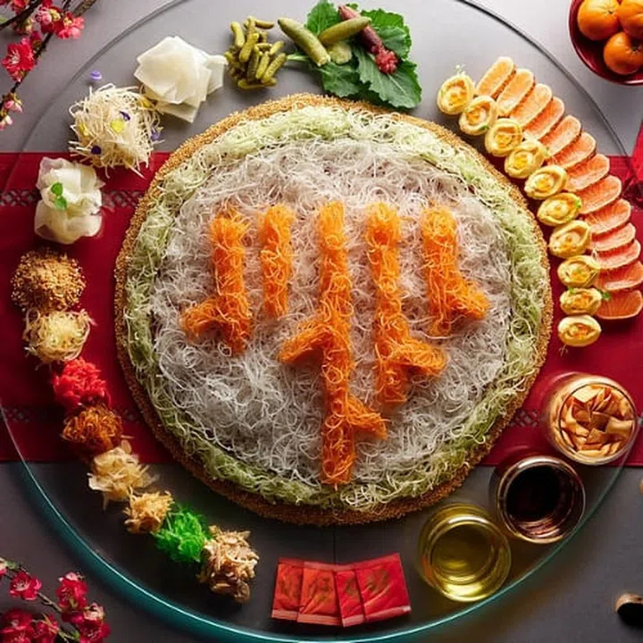 All the Yu Sheng creations have julienned rosella fruit added for a fruity, tart flavour and are dressed in a velvety, aromatic spring onion sauce made with spring onions and olive oil.
