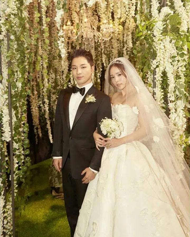 The actress tied the knot to BIG BANG's Taeyang amidst the dreamiest Twilight-esque forest setting, with a breathtaking Oscar de la Renta gown that suited the surroundings perfectly. The floral-embellished strapless silk faile gown was from the luxury brand's Fall 2018 collection, which she topped off with a matching veil, as well as a sparkling Joséphine Aigrette Impériale tiara from Chaumet.