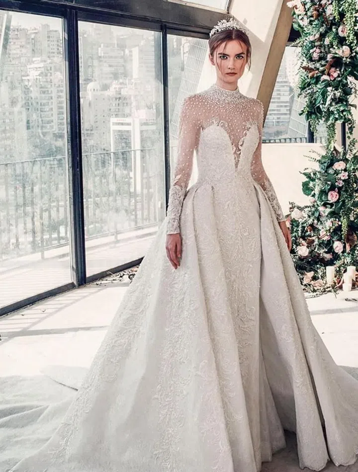 Structured fluid silhouettes and long sleeves are your ticket to a classic and regal wedding look - just think Grace Kelly's iconic wedding dress.