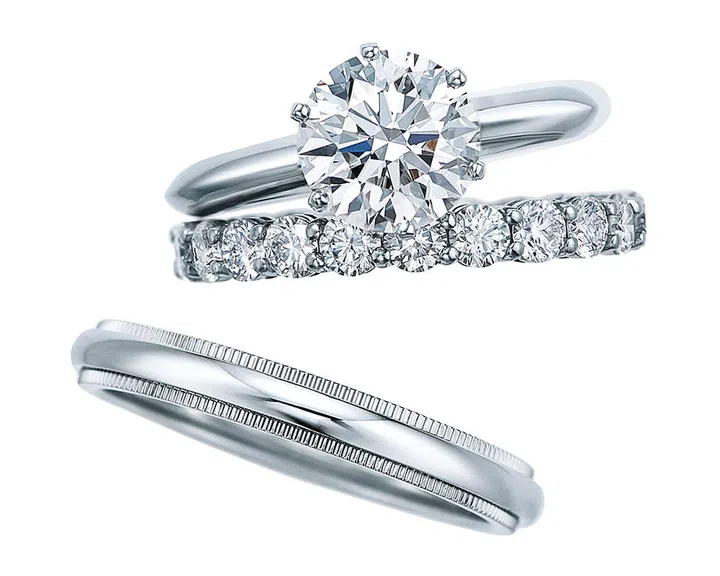 Pictured: The Tiffany® Setting, platinum ring with shared-setting with round brilliant diamonds and milgrain band ring