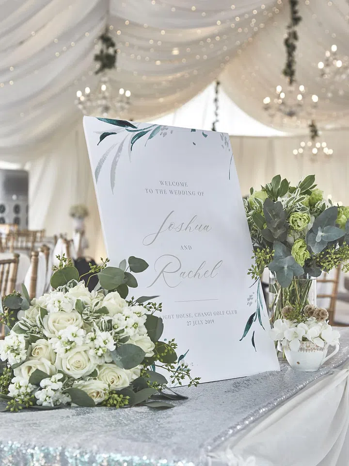 Short centrepieces, rich with the colour green, and set against the refined backdrop of the marquee at Changi Golf Club's Light House, impart a refreshing aesthetic that will undoubtedly appeal to the modern couple.