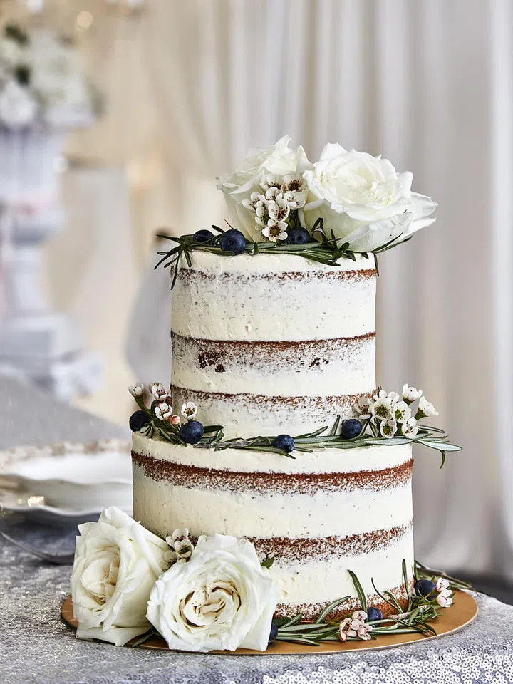 A semi-frosted cake dressed with blooms, berries and rosemary sprigs shows less can be more in the most delicious way that will have guests scrambling for a slice.