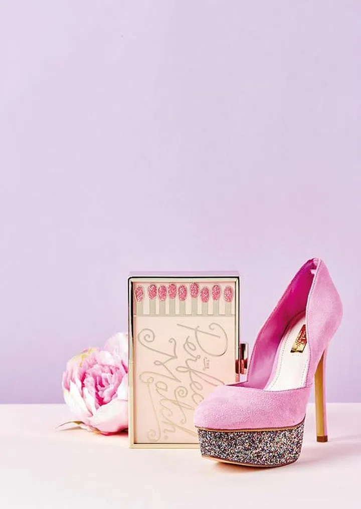 Resin and 14K gold-plated clutch, $660, from KATE SPADE NEW YORK. Kid suede and glitter platforms, $95.90, from CHARLES & KEITH.