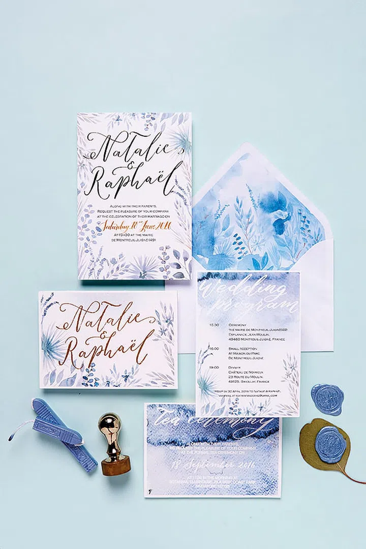 Send word of your romantic wedding with gorgeous watercolour invitations. Shades of blue are a fresh alternative to pink and peach floral.