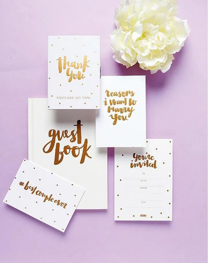 Thank You postcards, $22.90 for 25, Reasons I Want To Marry You card, $6.90, invitation, $19.90 for 10, gift card, $6.90, and guestbook, $31.90, from KIKKI.K.