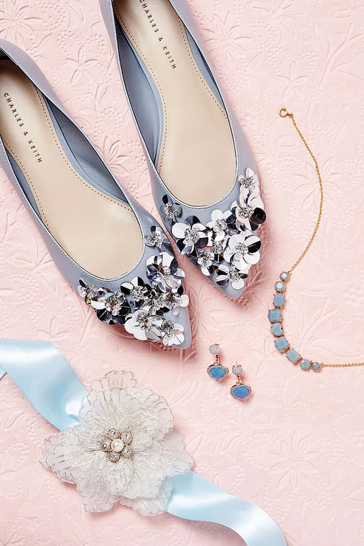 Sequinned faux leather ballerinas, $53.90, from CHARLES & KEITH. Les nereides 14K gold-plated brass necklace with faceted glass, $258, and 18K rose gold-plated bronze with cubic zirconia and blue chalcedony earrings, $338, from MIMENTO. Pearl-embellished embroidered flower on a satin sash, $138, from GIOIELLI.