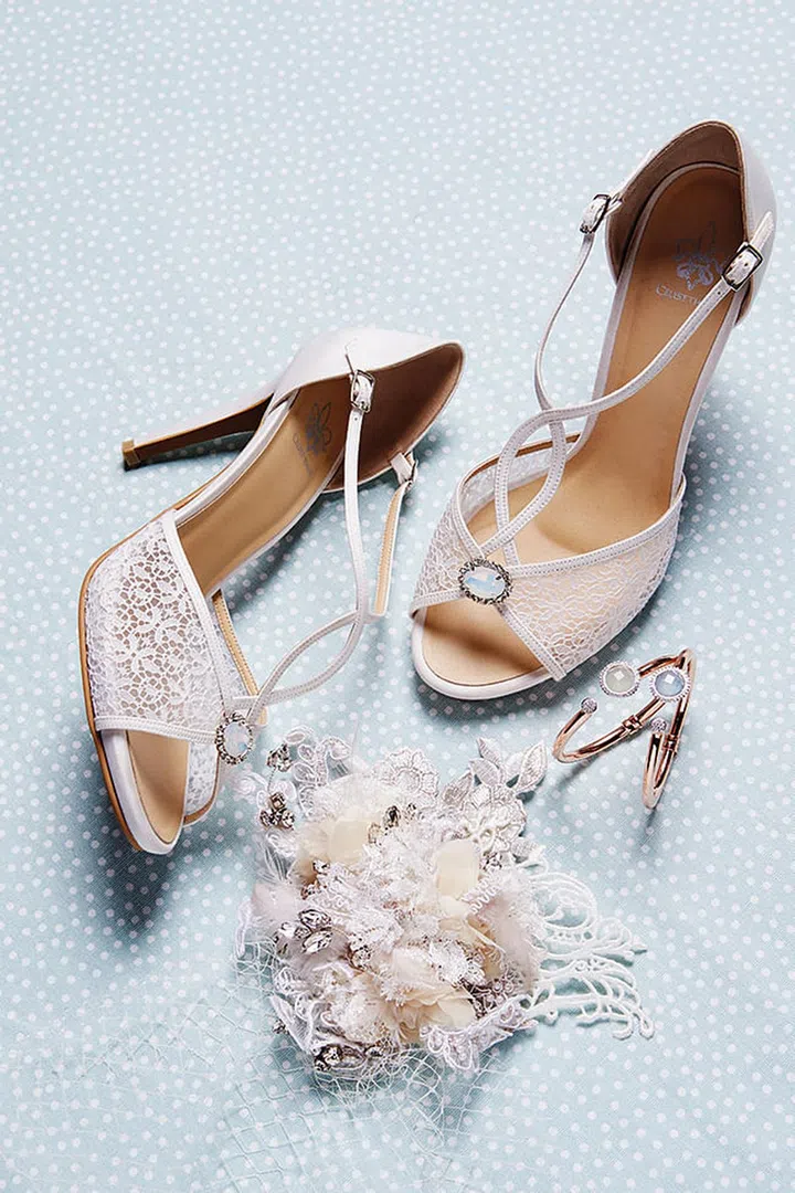 There's a reason why lace remans popular with brides - it's timeless, elegant and can be reinvented to look modern and stylish. Think lace heels updated with geometric straps, and a netted veil with crystals and 3-D floral appliques.
