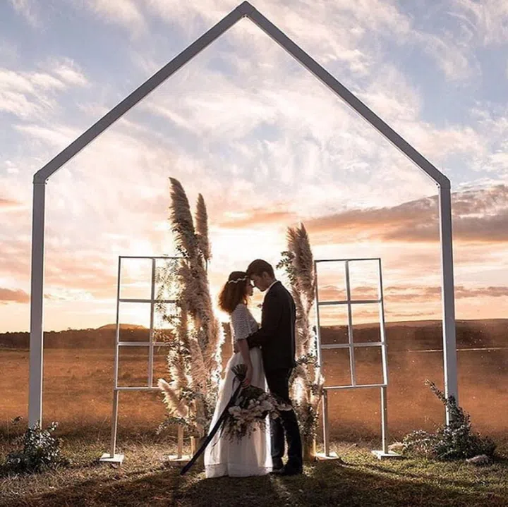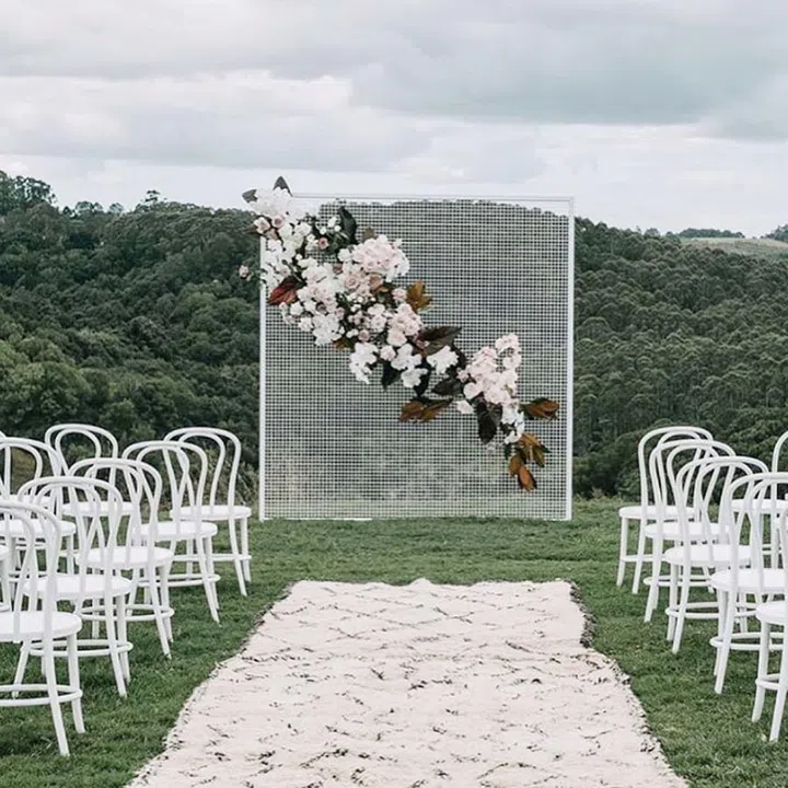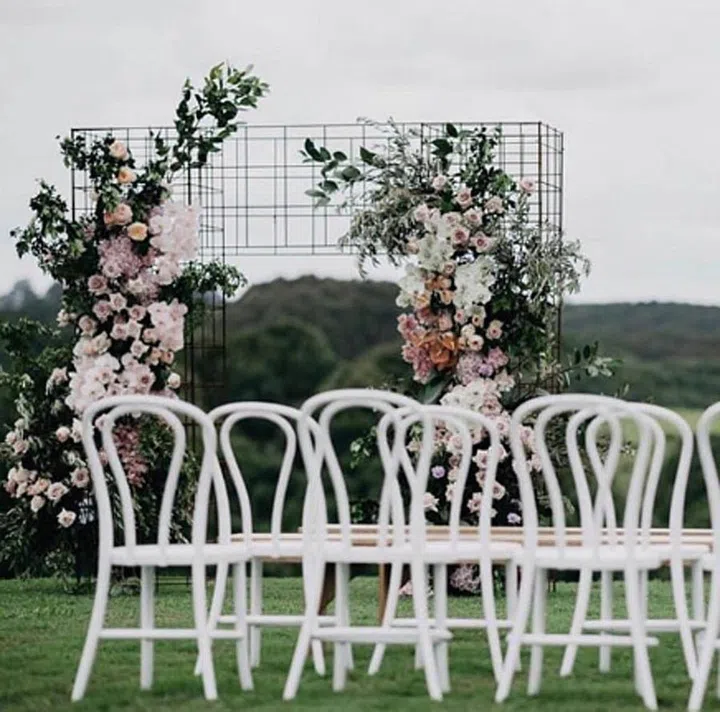 Take the mesh or gridded look a notch up with a gridded arch instead. This stark black lends a gritty, industrial contrast against an outdoorsy, natural backdrop. Pretty it up with lush florals and white bentwood chairs for a wedding-worthy touch.