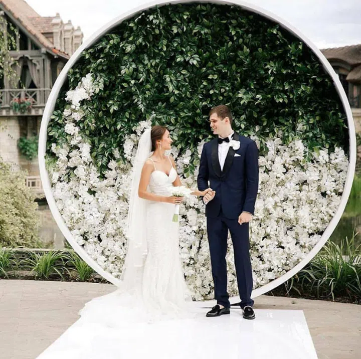 A flower wall doesn't have to be a rectangle or square. This stunning circular design covered in lots of foliage and blooms is both unique and still ultra-romantic, especially for a sophisticated soiree. You can also repurpose it for the reception as a photobooth backdrop!