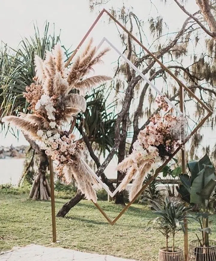 The freewheeling arrangements and lush pampas grass in neutral tones soften this graphic backdrop for a rustic-meets-modern appeal.