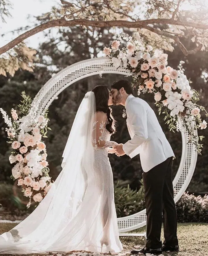 Hampton Event Hire offers a brand-new perspective on wedding arches with this circular mesh structure, decked out in its bridal best thanks to ultra-romantic blooms.