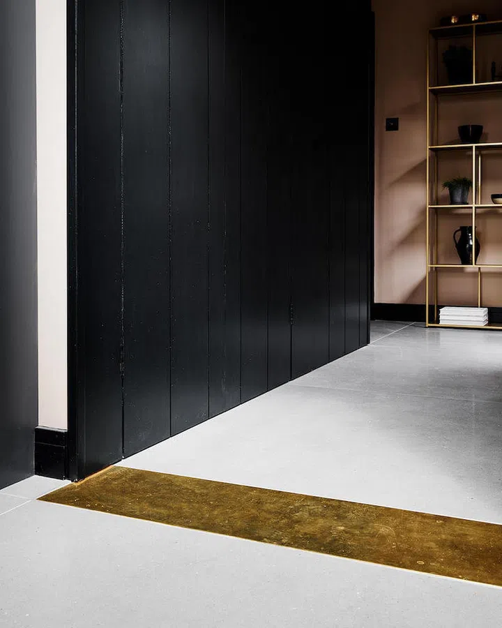 This brass inset is a clever and subtle way to separate communal from private spaces. See more of the home here.