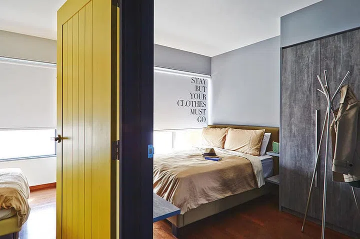 Customised (and a tad kinky!) blinds and bedroom doors in bright colours offer this tiny home a personalised touch.