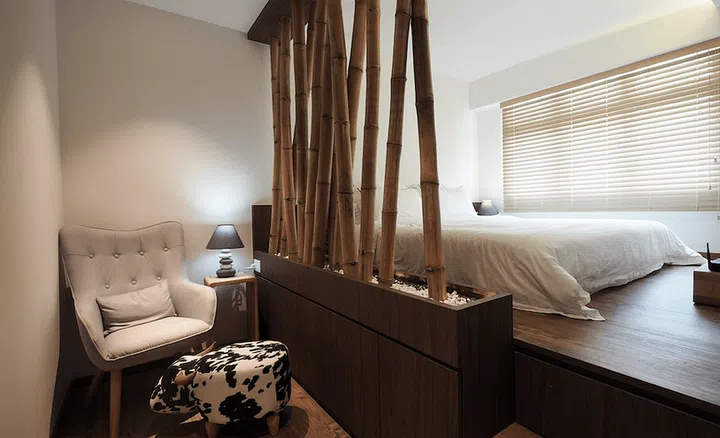 Real bamboo pieces were used to create a screen in this master bedroom, which has a 600mm-high platform bed to create a cosier sleeping space.