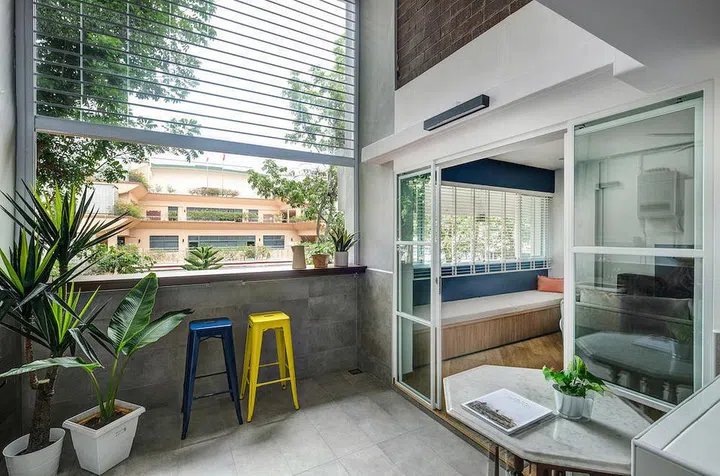 Converting the double-volume balcony into an interior space, and the use of glass doors, create a sense of seamless connection across the different areas of this home.