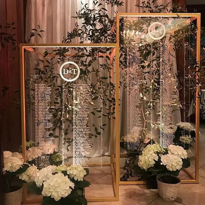 This statement-making brass display stand with acrylic panels doubles up as a seating chart and floral arrangement, and is suitable for a grand ballroom reception.