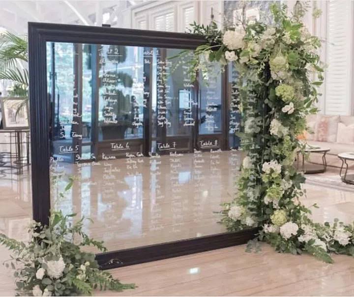 Here’s how you can make your seating display a focal piece of your wedding décor: this stand-alone mirrored frame imbues extra prettiness with a lush, overflowing floral arrangement.