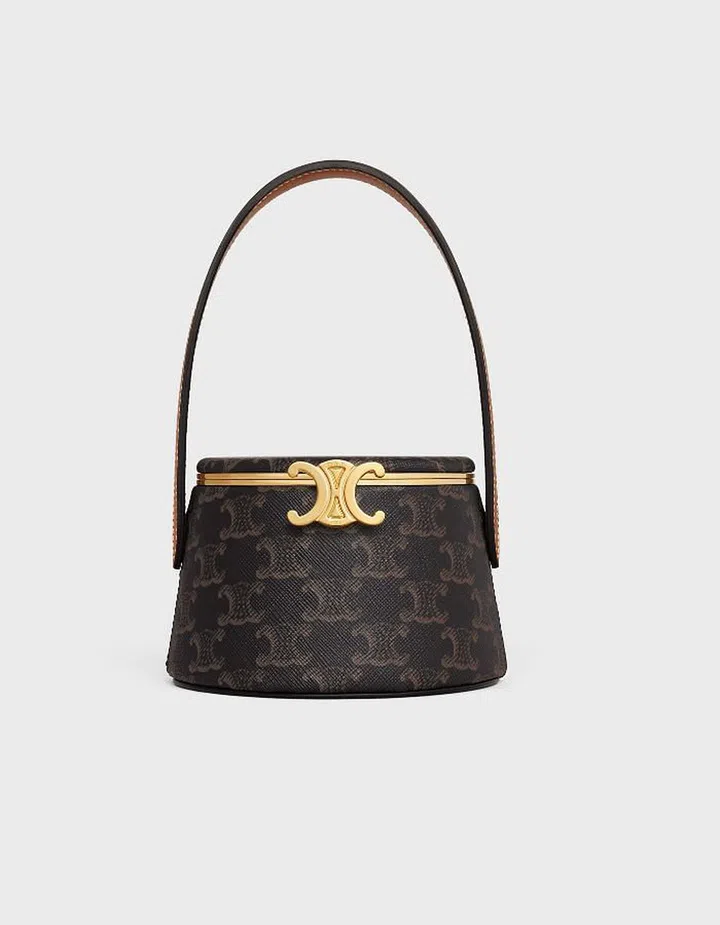 Designed in the 1970s, Celine’s iconic Triomphe motif with its intertwined “Cs” was inspired by the chain links that can still be seen in front of one of Paris’s most famous monuments – the Arc de Triomphe. It was reimagined in 2018 by former creative director Phoebe Philo, who used it as the hardware buckle on the brand’s classic box bag. Hedi Slimane, Celine’s current creative director, continues to reinterpret this motif and present in various avatars including The Classique Triomphe bag in canvas and calfskin, Teen Besace Triomphe Bag in calfskin and Small Bucket Cuir in textile and calfskin. For its latest instalment, the Triomphe is celebrated in its full glory on the Round Triomphe Minaudiere – a unique new shape for the Spring/Summer 2023 season – seen on the body of the canvas bag as well as the hardware clasp.