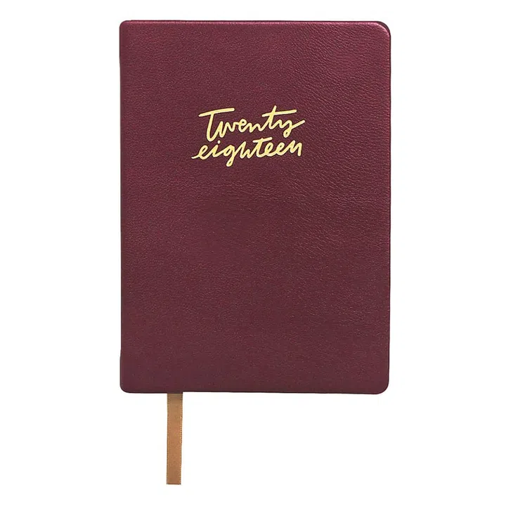 This compact weekly planner is made of genuine leather in the colour burgundy. With the gold foil of a hand-written 2018, this simple piece will stay timeless yet classy.